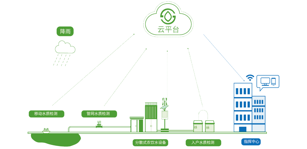 针对分布式农饮水处理站点多且分散,固润科技构建了分布式智慧净水处理站,通过智能控制,精准加药、设备全生命周期管理等手段,实现水站全自动、低成本运行。同时通过布置水质传感器,漏损传感器结合供水信息化平台实现了从“源头“到”龙头“的水安全监测及供水漏损控制;