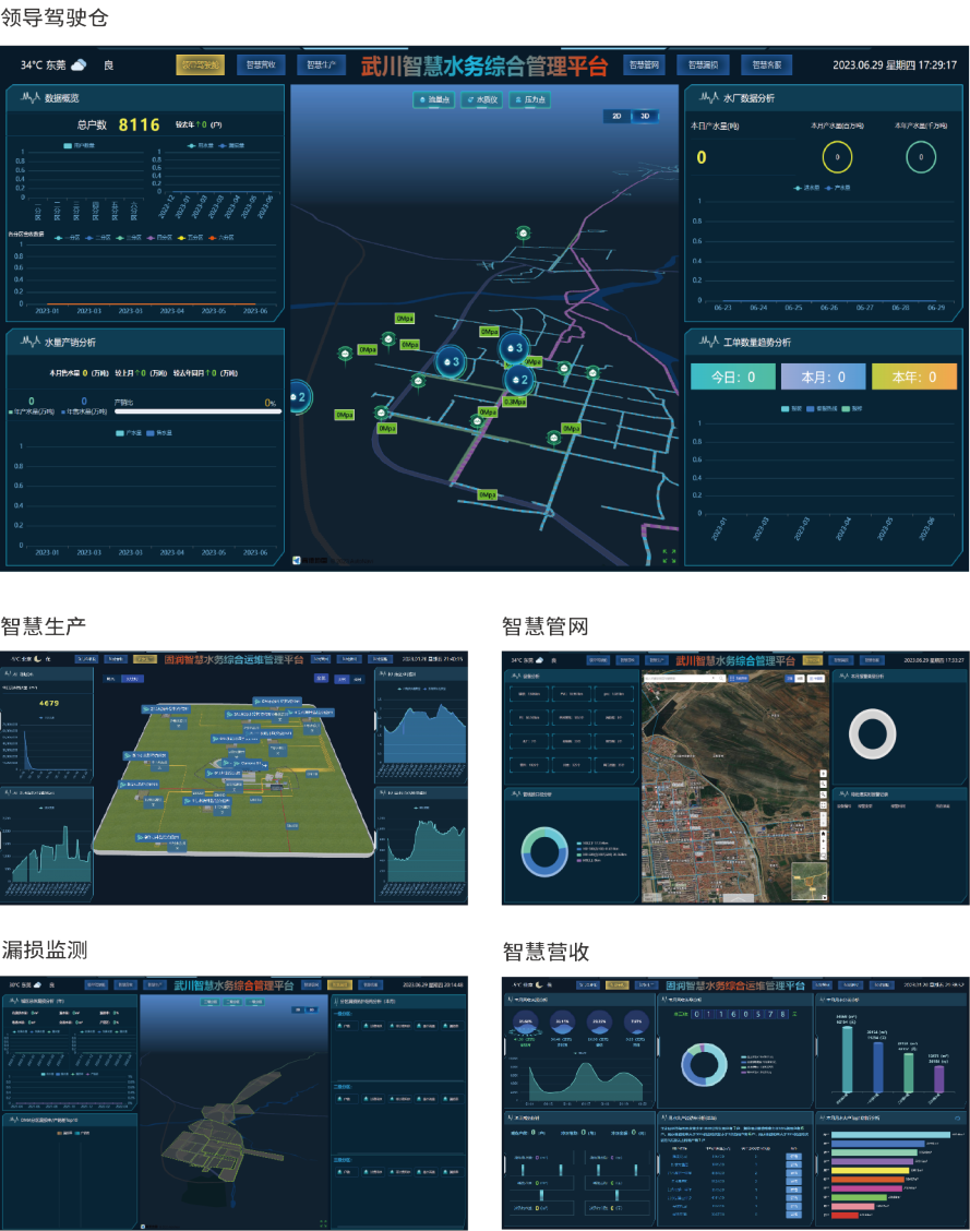 供水信息化解决方案:平台集综合指挥调度系统、智慧供水生产调度系统、水源综合管理系统、水厂/泵站无人值守系统、管网信息化管理系统、DMA分区计量与漏损管理系统、二次供水信息化监管系统、城市生态用水计量管理系统、维修派工管理系统于一体,实现水务信息化平台数字化、信息化、智能化、标准化;